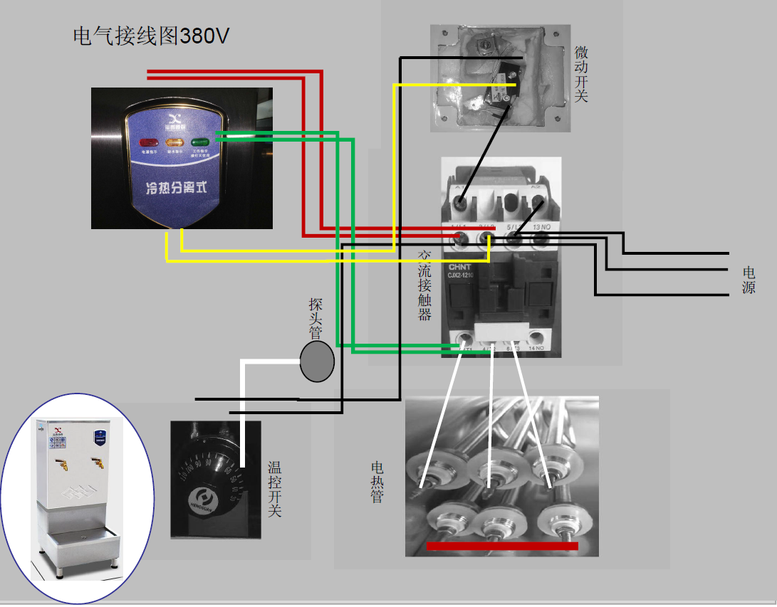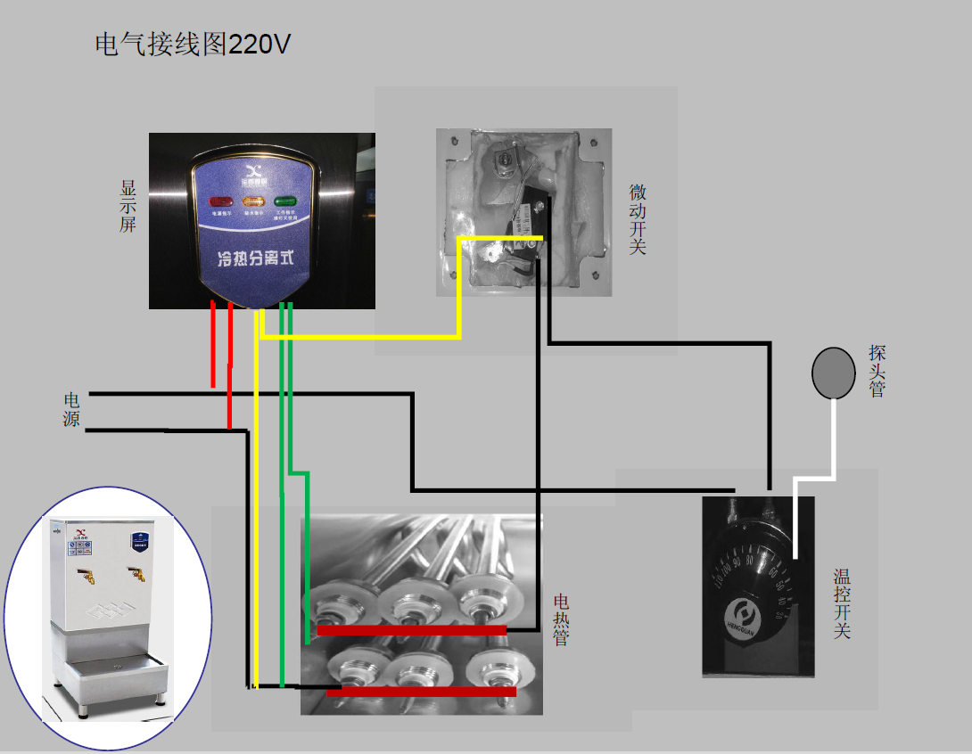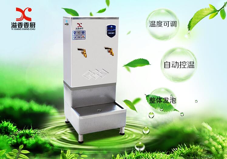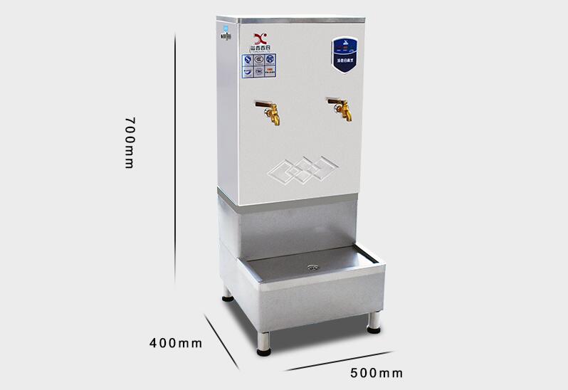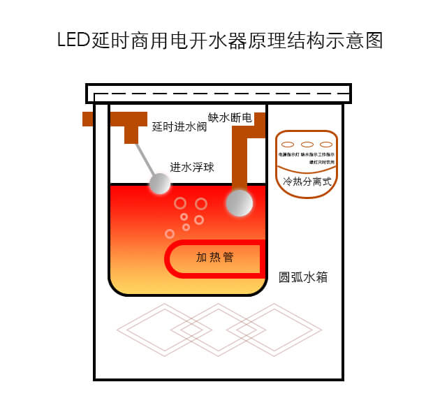 自来水经过进水电磁阀、蒸汽冷凝装置、进水管后,再进入水箱底部,当水位达到低水位电极后,马上通电加热,约5分钟可烧开,然后逐步进水,逐层烧开,电脑精准控温确保仅一次沸腾。既开既用,连续供水,沸腾产生的蒸汽经过蒸汽冷凝装置的内、外管之间,被冷却成冷凝水排出。