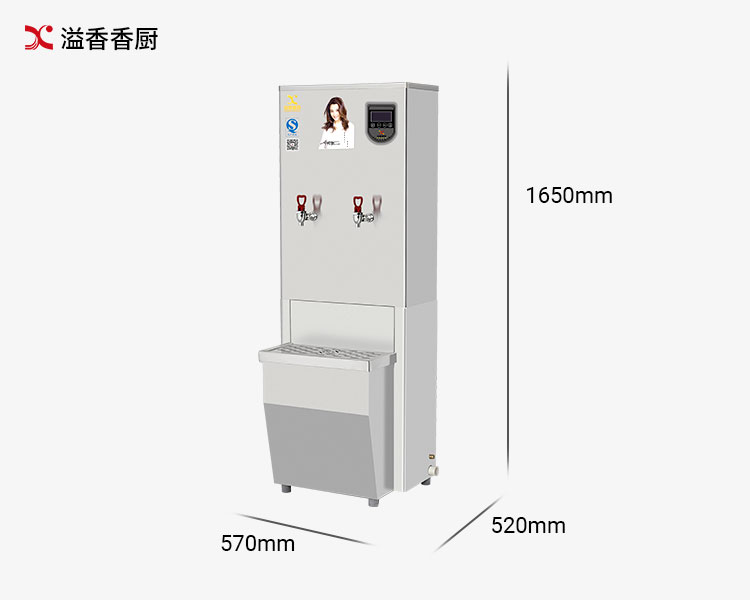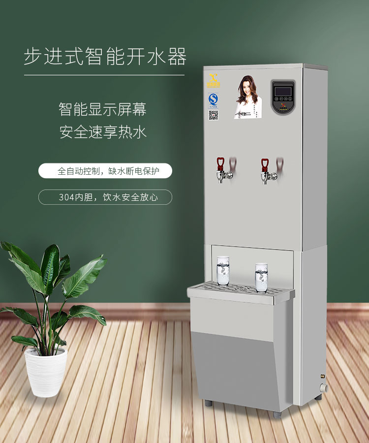 自来水经过进水电磁阀、蒸汽冷凝装置、进水管后,再进入水箱底部,当水位达到低水位电极后,马上通电加热,约5分钟可烧开,然后逐步进水,逐层烧开,电脑精准控温确保仅一次沸腾。既开既用,连续供水,沸腾产生的蒸汽经过蒸汽冷凝装置的内、外管之间,被冷却成冷凝水排出。