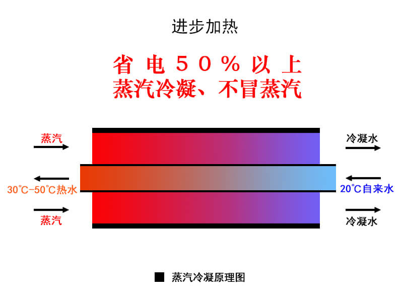 自来水经过进水电磁阀、蒸汽冷凝装置、进水管后,再进入水箱底部,当水位达到低水位电极后,马上通电加热,约5分钟可烧开,然后逐步进水,逐层烧开,电脑精准控温确保仅一次沸腾。既开既用,连续供水,沸腾产生的蒸汽经过蒸汽冷凝装置的内、外管之间,被冷却成冷凝水排出。