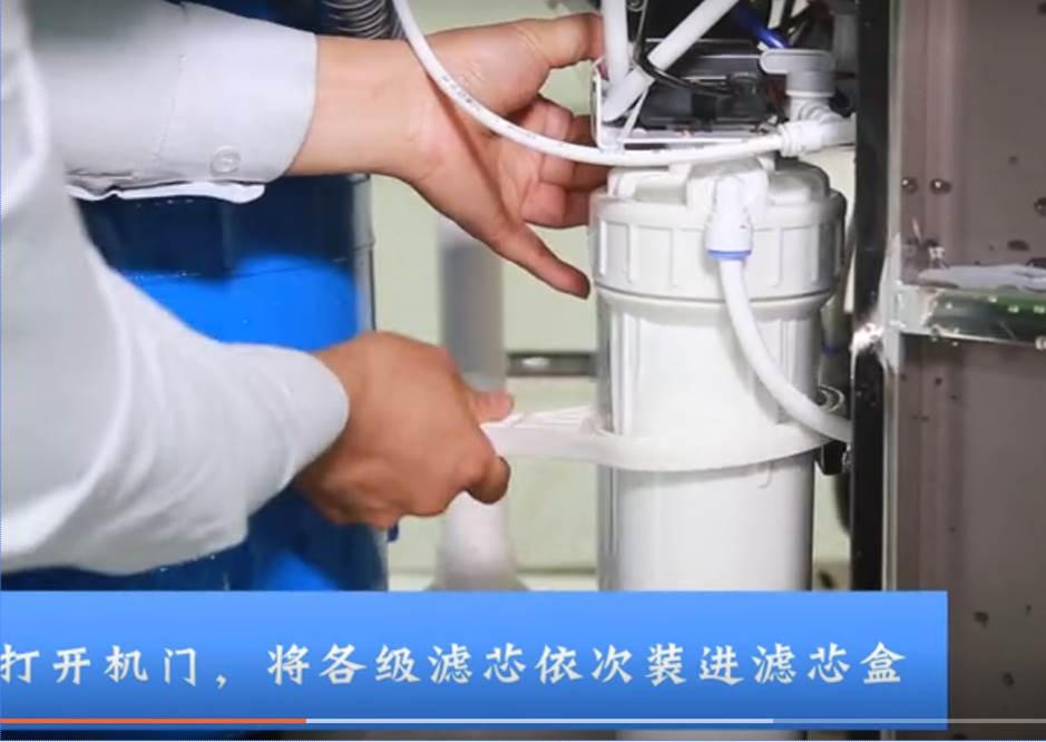 3、打开机门,将各级滤芯依次装进滤芯盒