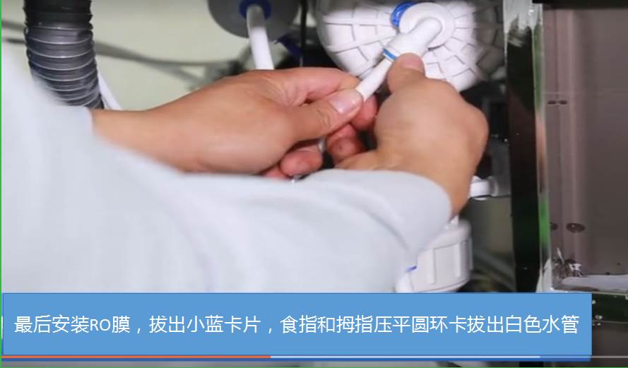 6、最后安装RO膜,拔出小蓝卡片,食指和拇指压平圆环卡拔出白色水管